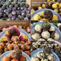 Een leuke cadeauset met 18 parels van elk 8 gram thee. Sheng (raw) pu-erh met bloemen als lelie, jasmijn, crysanthemum en moederkruid.