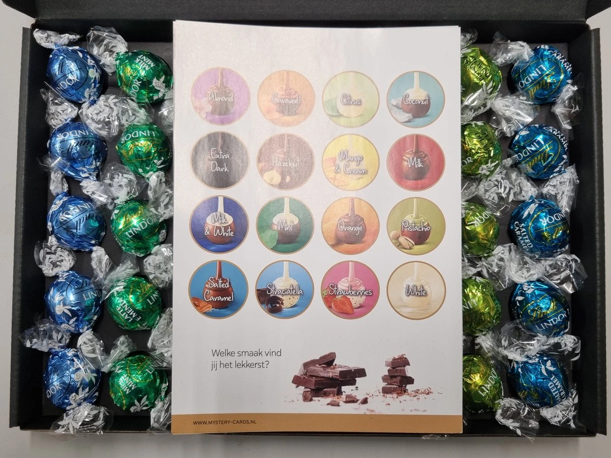 Proeverij van 8 verschillende chocolade smaken van Lindt kwaliteitschocolade in 1 box door de brievenbus.
