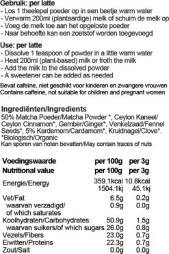 GOED UITGEBALANCEERDE SMAAK & MOOIE KLEUR: Deze latte is een mix van pure Japanse Matcha groene thee en vijf verschillende poedervormige kruiden zoals kostbare groene kardemom en zoete Ceylon kaneel. Het heeft een goed uitgebalanceerde smaak. Matcha zelf heeft een licht bittere smaak, een perfecte match met de zoete geur van kaneel en de fruitige smaak van groene kardemom. Samen met andere kruiden zorgt deze latte mix voor een unieke en verfrissende smaak.