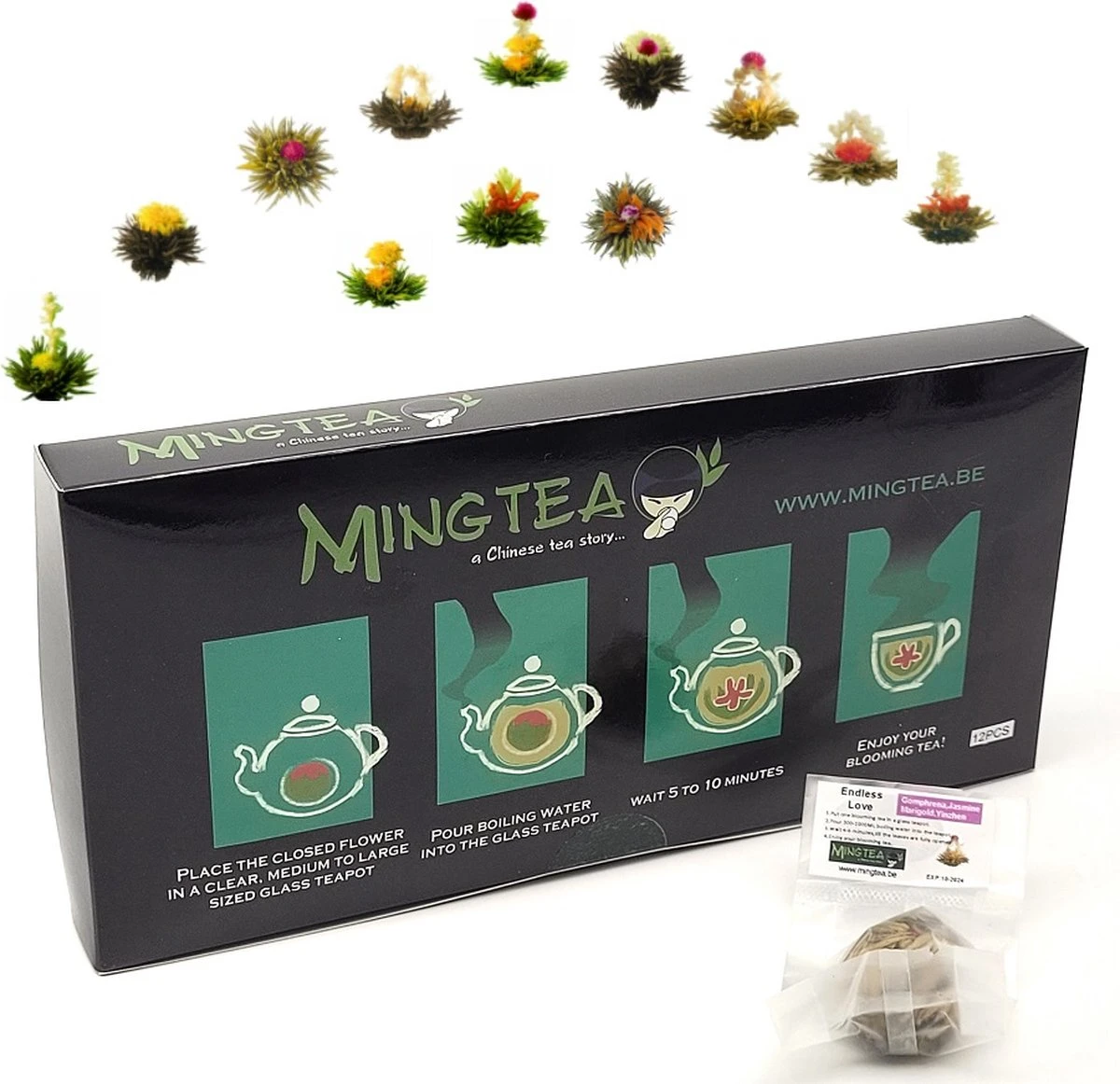 Onze theebloemen zijn een streling voor het oog én een plezier voor de mond! Elke theebloem is met de hand gemaakt, is 100% natuurlijk. Ze bevatten eveneens veel heilzame eigenschappen, die verschillen van bloem tot bloem. De gedroogde bloem wordt met de theebladeren handmatig samengebundeld tot een theebolletje. Eens men kokend water over het “theebolletje” geschonken heeft, zal deze zich na enkele minuutjes openen tot een wondermooie bloem.Maak deze blooming teas klaar in een glazen theepot, zo kun je het ontvouwen van de bloem bewonderen! Voor eigen gebruik of als cadeau, je zal er alvast iedereen blij mee maken!