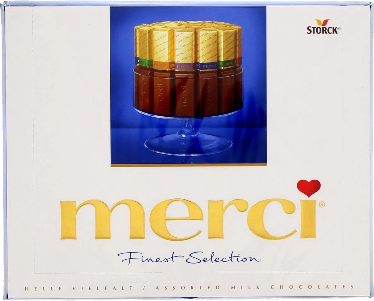 Merci chocolade! Leuk om weg te geven, of gewoon voor jezelf. bevat 20 stuks chocolade, met verschillende smaken. Dat is 250 gram melk chocolade.