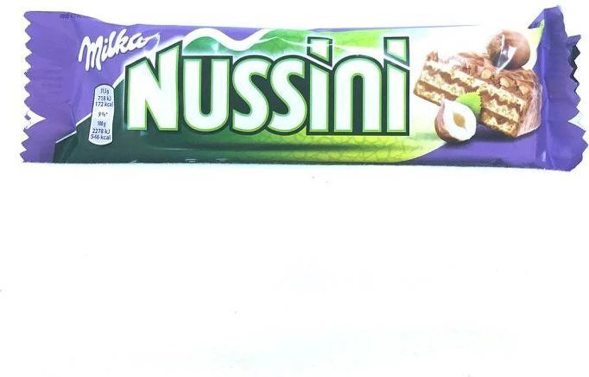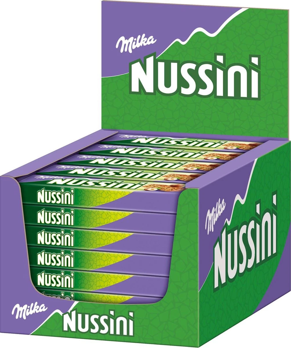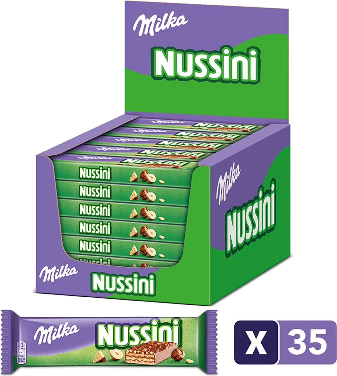 | Verpakkingsinhoud | 35 chocoladerepen Milka Nussini van elk 31g. Goed voor in totaal 1085g. |