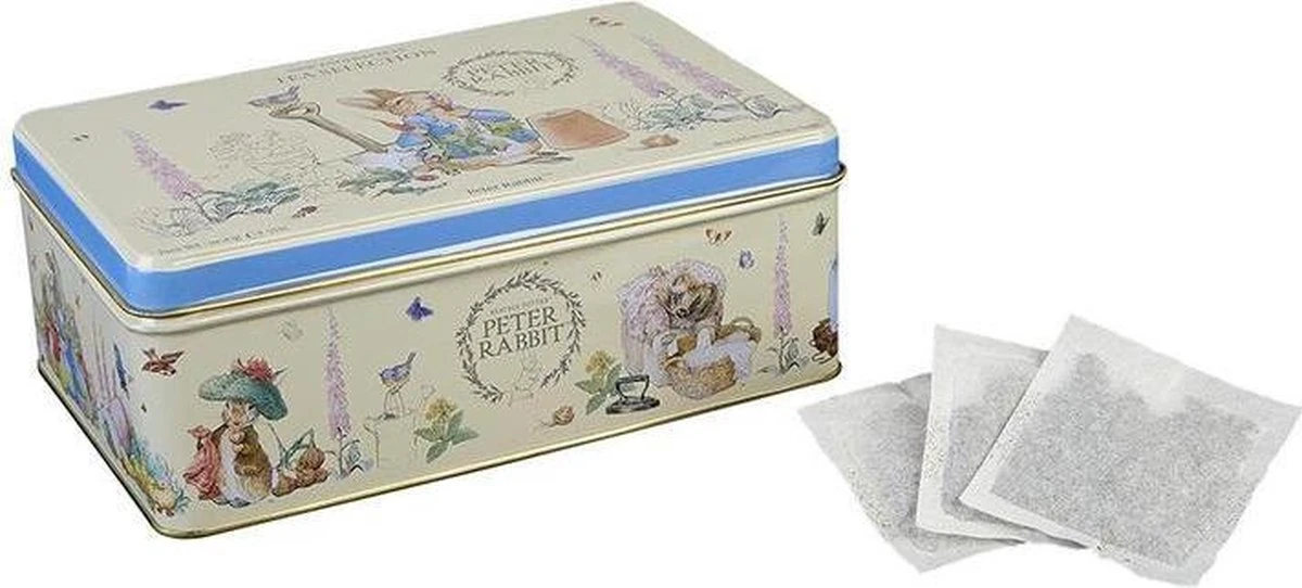 Een stijlvol blik met de beroemdste afbeeldingen in dieren karakters van Beatrix Potter. Bevat een selectie van 100 theezakjes met drie variëteiten – English Breakfast tea, English Afternoon tea en Earl Grey tea . De geschenkverpakking is gewild bij theeblik verzamelaars