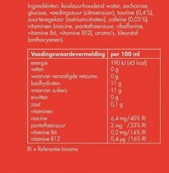 Red BULL VERLEENDE VLOGEL in 1987 was niet alleen de introductie van een geheel nieuw product, maar de geboorte van een geheel nieuwe productcategorie – energiedranken. Red Bull geeft mensen en ideeën vleugels en zet opmerkelijke mijlpalen in sport en cultuur. Consumptiemogelijkheden: de drank is ontwikkeld voor tijden met verhoogde inspanning en wordt wereldwijd gewaardeerd door topsporters, studenten, in sterk veeleisende beroepen en bij lange autoritten. Voor mensen die willen afzien van suiker, maar niet van Red Bull: de suikervrije Red Bull Sugarfree geeft vleugels zonder suiker. Red Bull was wereldwijd het eerste merk in de Energy Drink Categorie, die de wens van de consumenten naar een suikervrije variant herkende en introduceerde Red Bull Sugarfree. Ingrediënten cafeïne: cafeïne was al bekend bij de oude volkeren. Ze wonnen cafeïne uit natuurlijke bronnen zoals thee, koffie, cacaobonen en de kolanoot en waardeerden het stimulerende effect op het menselijk lichaam. Taurine: Taurine is een aminozuur dat in het menselijk lichaam en in de dagelijkse voeding voorkomt. Het is betrokken bij een groot aantal biologische processen. B-complex-vitaminen: vitaminen zijn essentiële micronutriënten die dienen voor het behoud van normale lichaamsfuncties. Deze B-complex-vitaminen dragen bij aan een normaal energiemetabolisme zoals de op- en afbraak van koolhydraten, eiwitten, evenals aan een normale mentale prestatie (pantotheenzuur) en de vermindering van vermoeidheid en vermoeidheid (niacine, pantotheenzuur, B6, B12). Bovendien spelen B-vitaminen een centrale rol in de hersenen. Ze dragen bij aan een normale werking van het zenuwstelsel. Suiker: Suiker is een van de bekendste koolhydraten en in veel voedingsmiddelen zoals fruit, vruchtensappen en de meeste dranken, onder andere energiedranken. Duurzaamheid Red Bull streeft zich bewust van de daaruit voortvloeiende verantwoordelijkheid en streeft er voortdurend naar om verbeteringen te implementeren die het milieu ten goede komen. Red Bull heeft bewust besloten om 100% recipiënbare aluminium blikjes te gebruiken en ontwikkelde koelkasten, die dankzij hun koelmiddel aanzienlijk milieuvriendelijker zijn dan conventionele koelkasten en tot 45% minder energie nodig hebben.