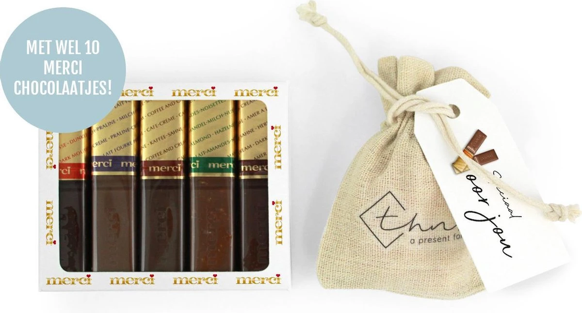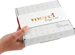 Merci dat jij er bent! Het cadeaudoosje voor de brievenbus, gevuld met 10 heerlijke chocolaatjes van het beroemde merk wordt, bedrukt met een ontwerp dat heel veel lijkt op die van de Merci stijl.